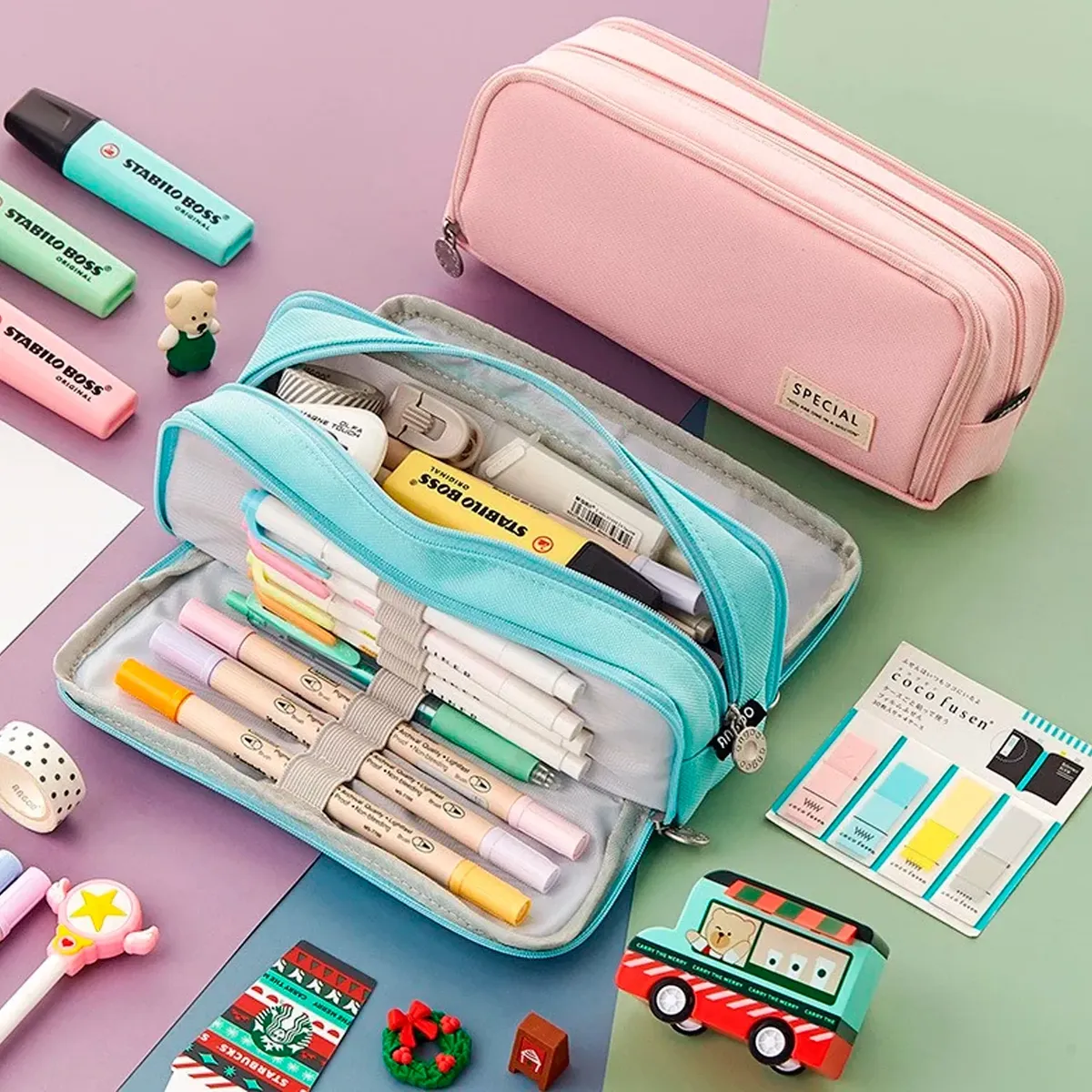 Bolsillos de Malla: compartimentos internos con red para guardar objetos pequeños como borradores, sacapuntas, notas adhesivas o cintas decorativas.
