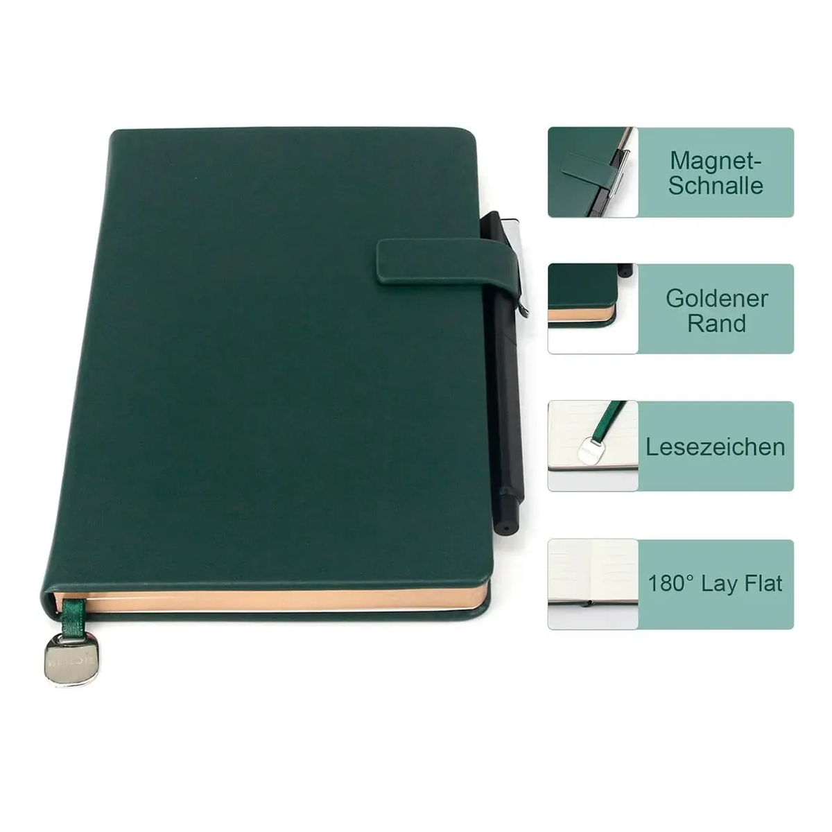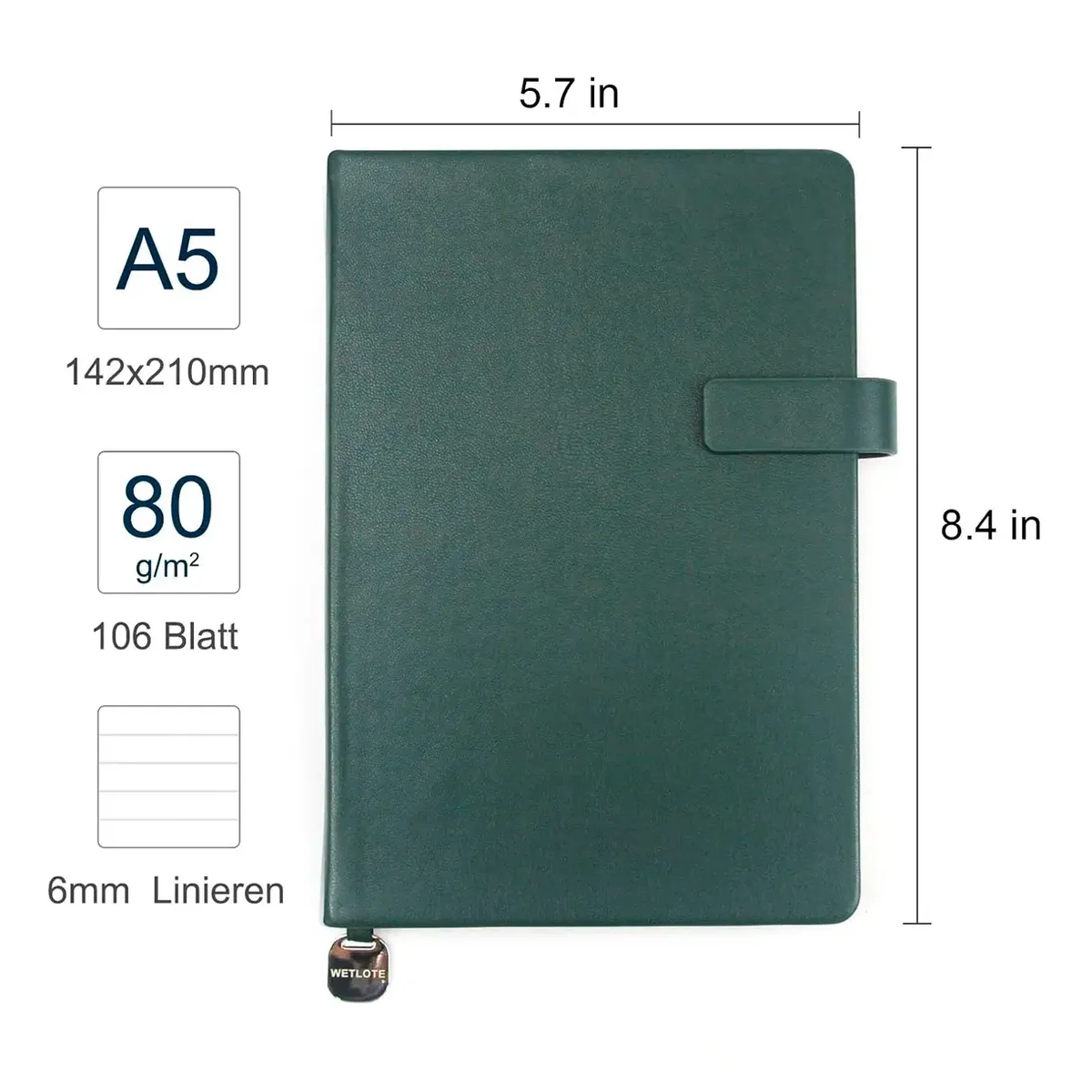 El cuaderno WETLOTE A5 de tapa dura combina un diseño elegante con una funcionalidad bien pensada. Con su superficie de piel sintética suave, la práctica pestaña de cierre con trabilla para bolígrafo, corte dorado y marcapáginas, cada escritura será una experiencia especial.