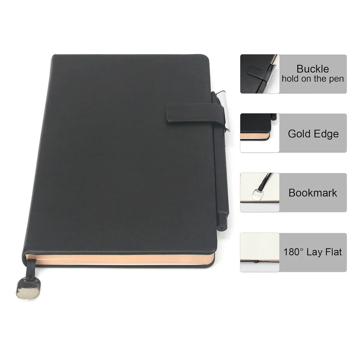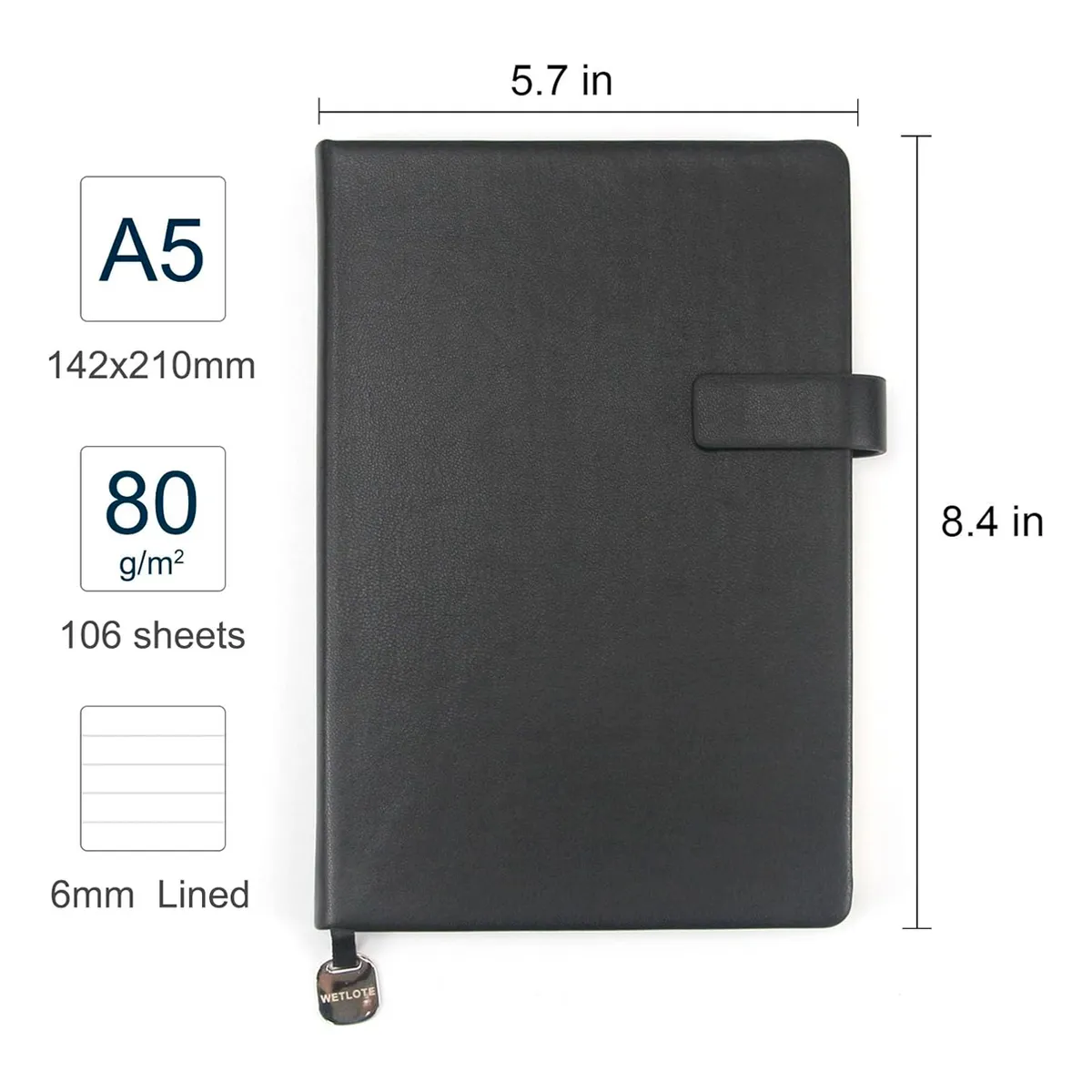 El cuaderno WETLOTE A5 de tapa dura combina un diseño elegante con una funcionalidad bien pensada. Con su superficie de piel sintética suave, la práctica pestaña de cierre con trabilla para bolígrafo, corte dorado y marcapáginas, cada escritura será una experiencia especial.